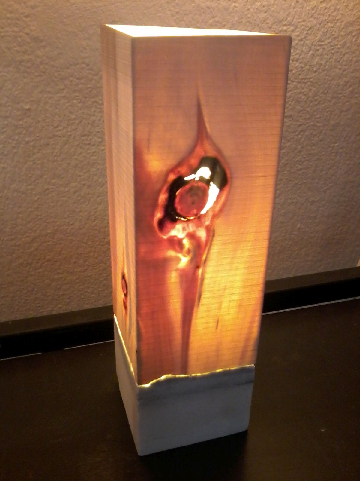 Auf einem quadratischen Marmorwürfel mit einer Seitenlänge von 8 cm streckt sich eine Säule aus hauchdünnen Zirbelholzstreifen in die Höhe. Sobald die Glühbirne im Inneren mittels eines kleinen Kippschalters erleuchtet, aktiviert die entstehende Wärme den betörenden Duft der Südtiroler Zirbe und wirkt so als "Duftlampe". Harze, ätherische Inhaltsstoffe, Äste und Verformungen kommen wahrlich durch das Licht an das Licht. Eine kaum vorstellbare Farben- und Formenwelt eröffnet sich dem Betrachter.